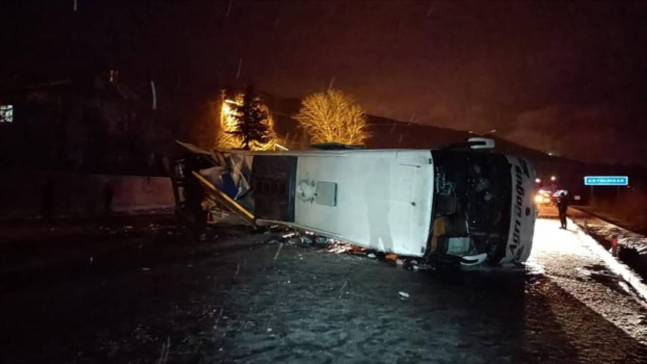 Sivas'ın Koyulhisar ilçesinde yolcu otobüsünün devrilen tıra çarptıktan sonra devrilmesi sonucu ilk belirlemelere göre 15 kişi yaralandı.