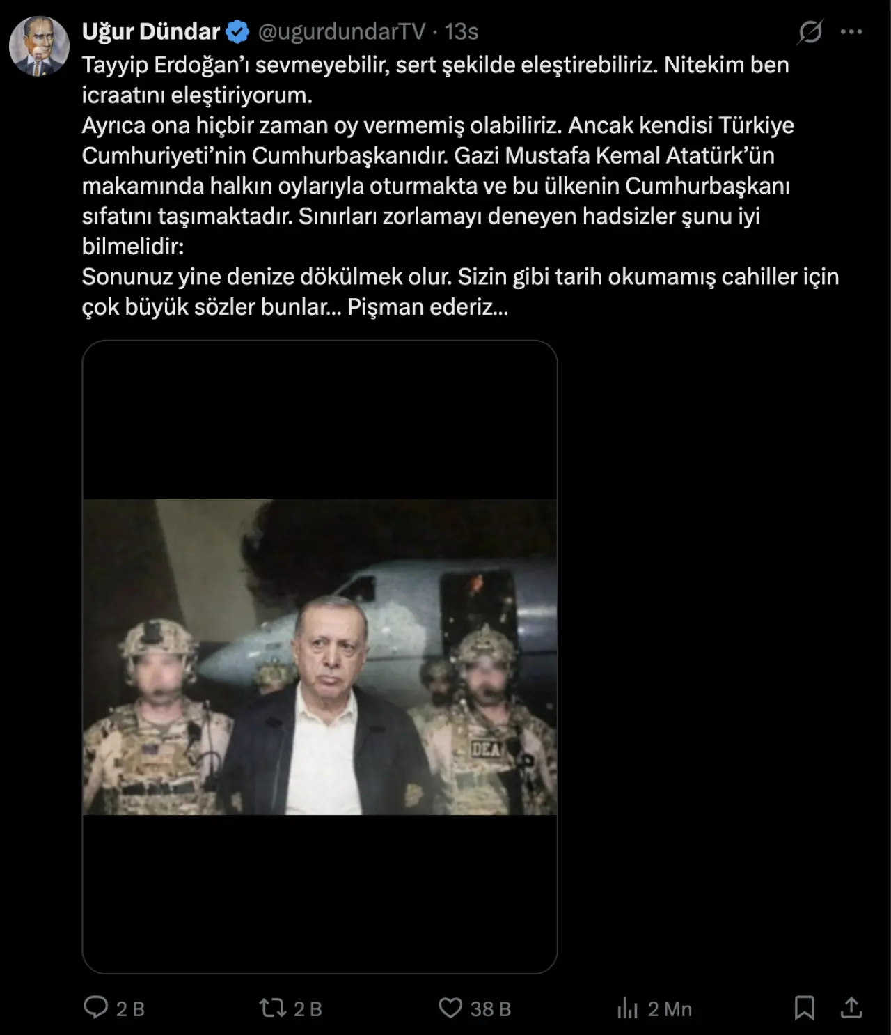 Uğur Dündar’ın açıklaması sosyal medyada kısa sürede geniş kitlelere ulaştı. Paylaşım, farklı görüşlerden birçok kullanıcı tarafından destek ve eleştiri yorumlarıyla gündemin üst sıralarına taşındı.