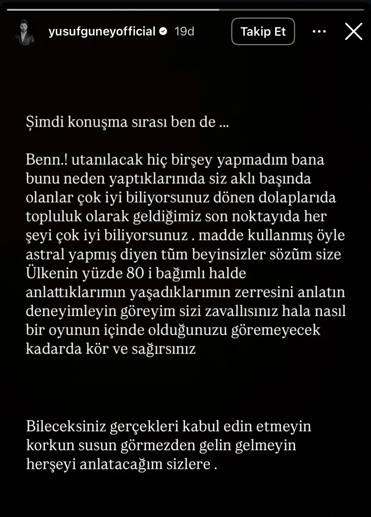 Yusuf Güney'in Adli Tıp Kurumu uyuşturucu testi sonuçları bugün açıklandı. Güney'in saçından alınan örneklerde ''Kokain'' tespit edildi. Test sonucunun ardından sosyal medya hesabından açıklama yapan Güney, "Utanılacak hiçbir şey yapmadım. Bana bunu neden yaptıklarını da siz çok iyi biliyorsunuz. Zavallısınız, hala nasıl bir oyunun içinde olduğunuzu göremeyecek kadar kör ve sağır mısınız?" ifadelerini kullandı.