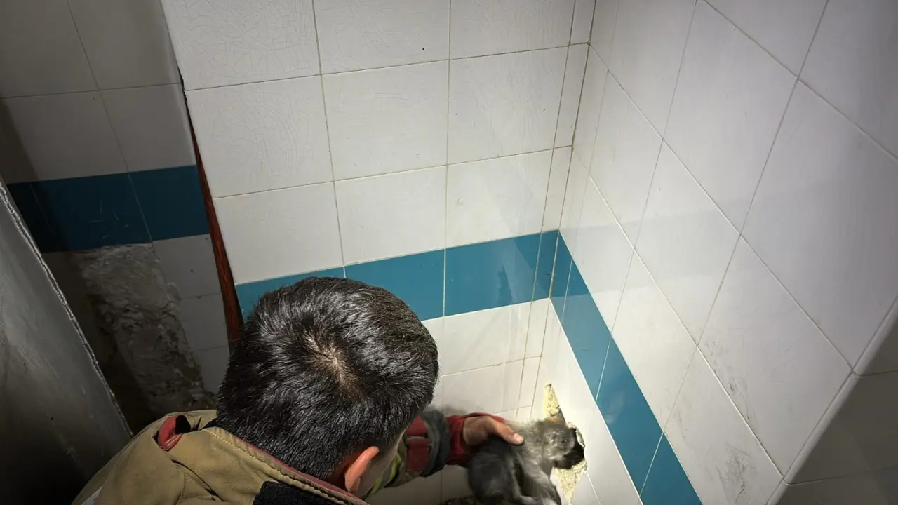 Hatay’da bacadan içeriye düşerek mahsur kalan yavru kedi, itfaiye ekiplerinin duvarda açtığı delikten kurtarıldı.