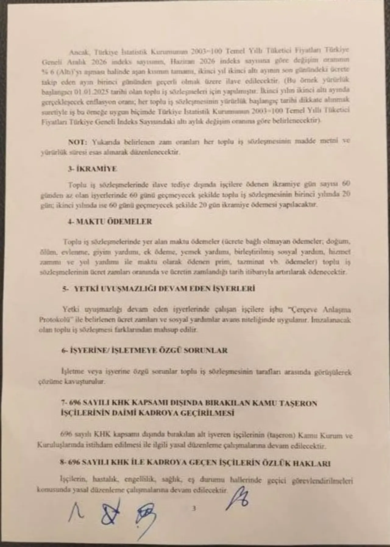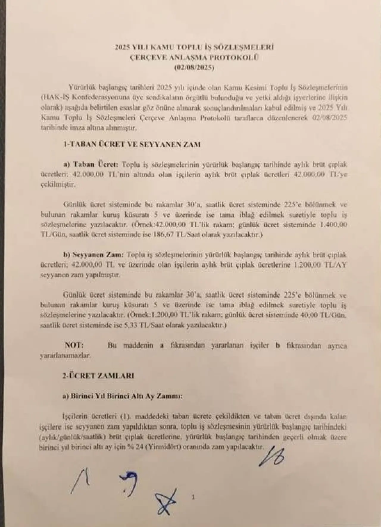 Yaklaşık 600 bin kamu işçisini ilgilendiren 2025-2026 dönemine ait Kamu Toplu İş Sözleşmeleri Çerçeve Protokolü imzalandı. Ancak protokolde yer alan düzenlemeler, hem taban ücret hem de seyyanen zam açısından sendikalar ve hükümet yetkilileri tarafından olumlu bir adım olarak sunulsa da, sahadan yükselen tepkiler bu açıklamalarla örtüşmüyor.