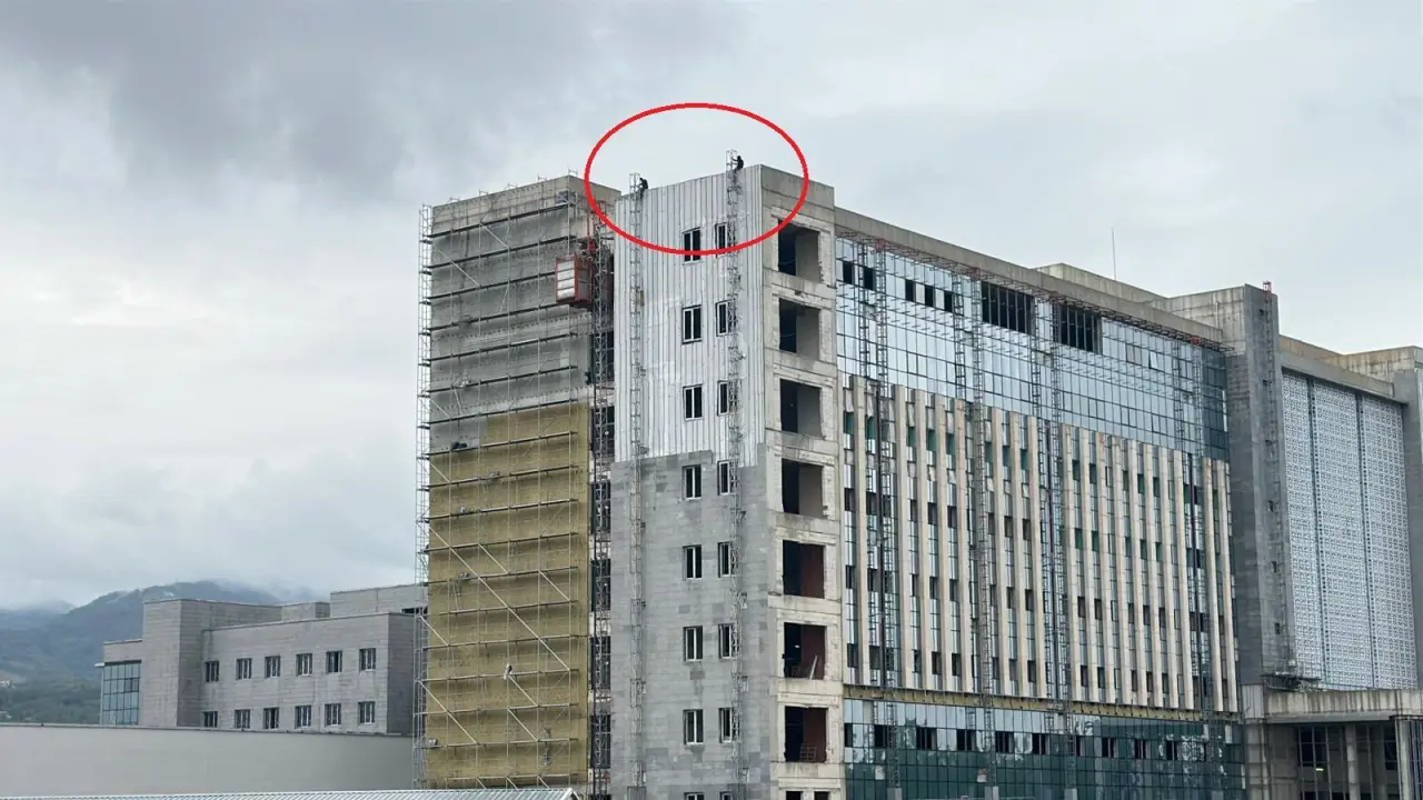 Samsun'un Tekkeköy ilçesinde yapımı devam eden devlet hastanesi inşaatında çalışan 2 işçi, taşeron firmadan paralarını alamadıkları gerekçesiyle inşaatın çatısına çıkarak eylem yaptı.