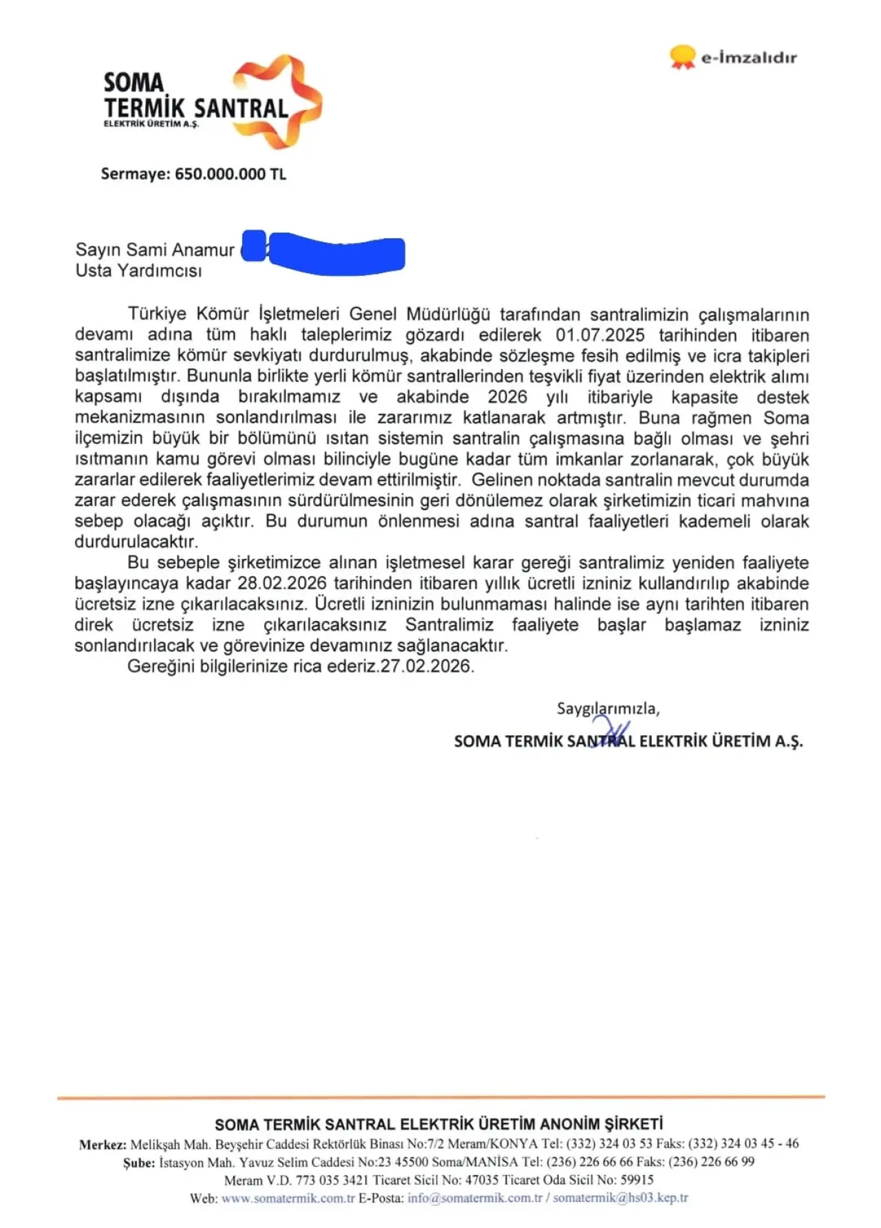 Gelinen noktada santralin mevcut durumda zarar ederek çalışmasının sürdürülmesinin geri dönülemez olarak şirketimizin ticari mahvina sebep olacağı açıktır. Bu durumun önlenmesi adına santral faaliyetleri kademeli olarak durdurulacaktır. Bu sebeple şirketimizce alınan işletmesel karar gereği santralimiz yeniden faaliyete başlayıncaya kadar 28.02.2026 tarihinden itibaren yıllık ücretli izniniz kullandırılıp akabinde Ücretsiz izne çıkarılacaksınız. Ücretli izninizin bulunmaması halinde ise aynı tarihten itibaren direk ücretsiz izne çıkarılacaksınız Santralimiz faaliyete başlar başlamaz izniniz sonlandırılacak ve görevinize devamınız sağlanacaktır.''