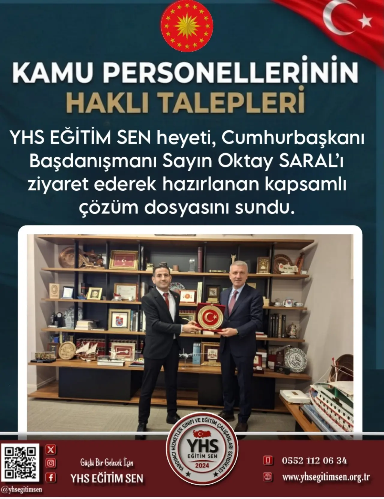 Yardımcı Hizmetler Sınıfı Eğitim Sendikası (YHS Eğitim-Sen) heyeti, Cumhurbaşkanı Başdanışmanı Oktay Saral’ı ziyaret ederek kamu personelinin çalışma hayatına dair beklentilerini içeren kapsamlı bir çözüm dosyasını sundu. Görüşmede, kamu çalışanlarının sorunlarının çözümü ve çalışma koşullarının iyileştirilmesi için gerekli teknik çalışmaların başlatılması konusunda mutabık kalındı.