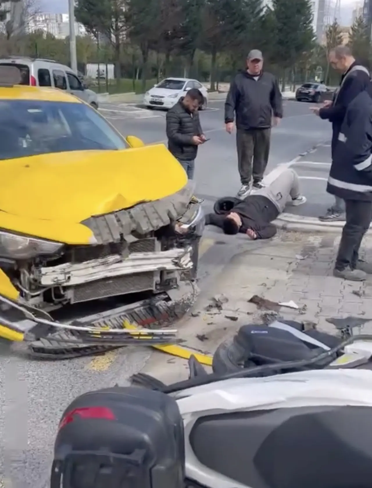 Çarpışmanın şiddetiyle motosiklet sürücüsü havaya savrularak yaralandı. İhbar üzerine olay yerine sağlık ve polis ekipleri sevk edildi. Yaralı sürücü, ambulansla hastaneye kaldırıldı. Polis ekipleri kazayla ilgili inceleme başlatırken, kaza anının güvenlik kamerası tarafından saniye saniye kaydedildiği öğrenildi. Görüntülerde motosikletin cadde üzerinde ilerlediği, taksinin dönüş yaptığı sırada iki aracın çarpıştığı ve sürücünün savrulduğu anlar yer aldı.