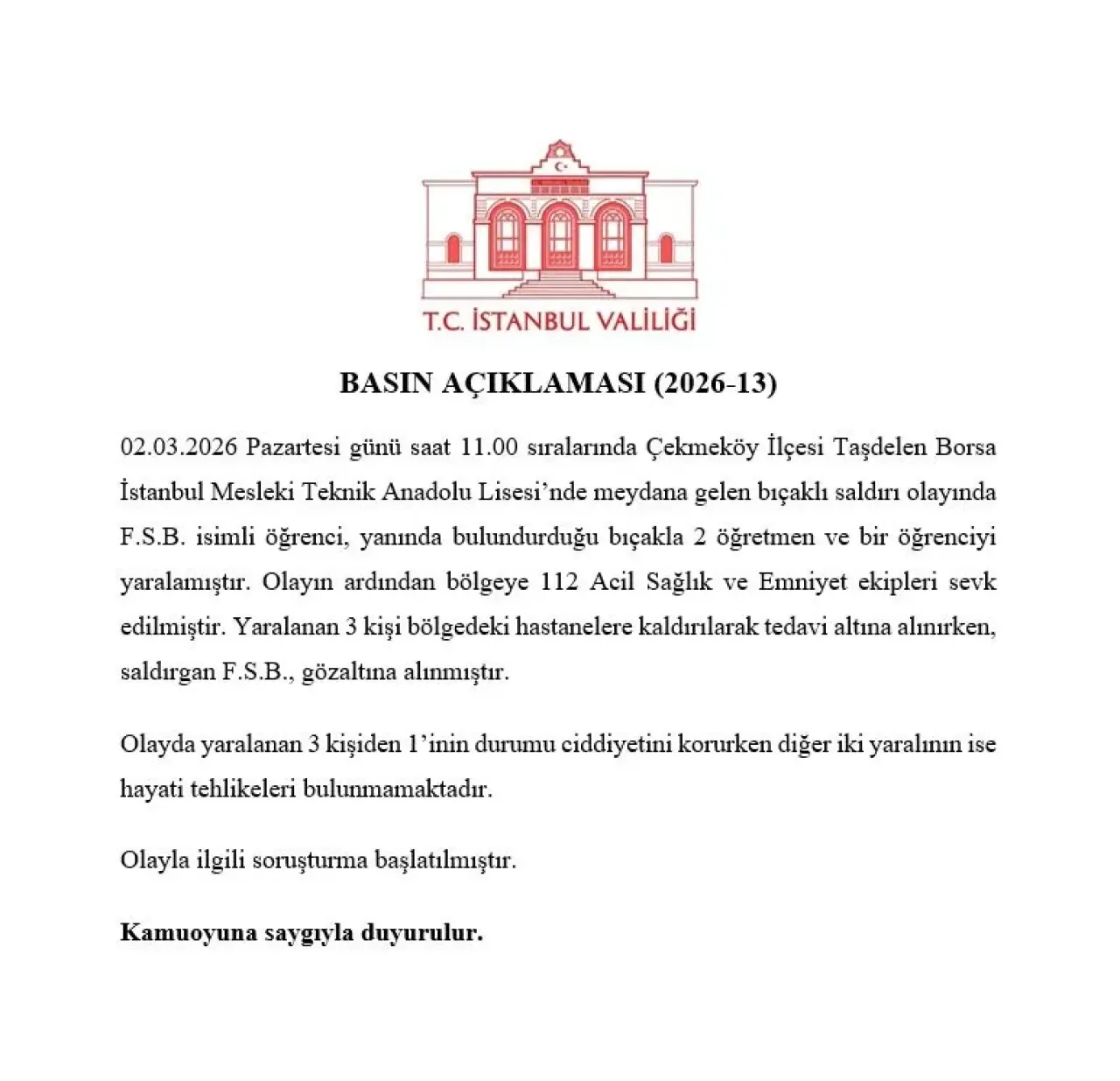 "02.03.2026 Pazartesi günü saat 11.00 sıralarında Çekmeköy İlçesi Taşdelen Borsa İstanbul Mesleki Teknik Anadolu Lisesi’nde meydana gelen bıçaklı saldırı olayında F.S.B. isimli öğrenci, yanında bulundurduğu bıçakla 2 öğretmen ve bir öğrenciyi yaralamıştır. Olayın ardından bölgeye 112 Acil Sağlık ve Emniyet ekipleri sevk edilmiştir. Yaralanan 3 kişi bölgedeki hastanelere kaldırılarak tedavi altına alınırken, saldırgan F.S.B., gözaltına alınmıştır.