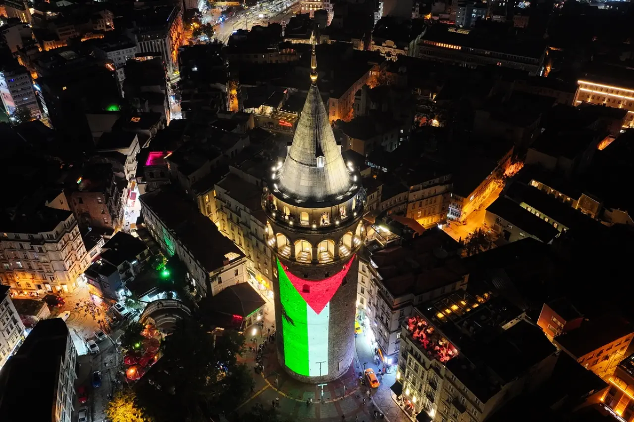 İstanbul’un simge yapılarından Galata Kulesi’nin cephesine, mapping tekniğiyle Filistin bayrağı yansıtıldı. Kültür ve Turizm Bakanlığı tarafından düzenlenen özel ışık gösterisiyle, Filistin halkının yaşadığı insani krize dikkat çekilmesi ve dayanışma mesajı verilmesi amaçlandı.