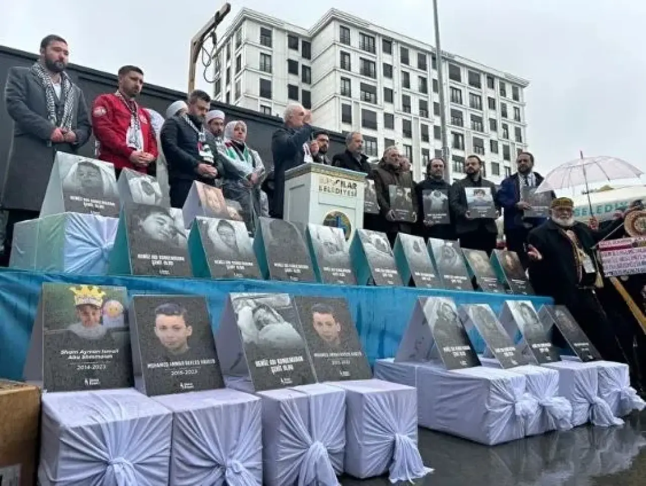 Gazze'de öldürülen çocuklara dikkati çekmek amacıyla platforma temsili kefene sarılı çocuk tabutları bırakılan eylemde, Müslümanlar için dua edildi.