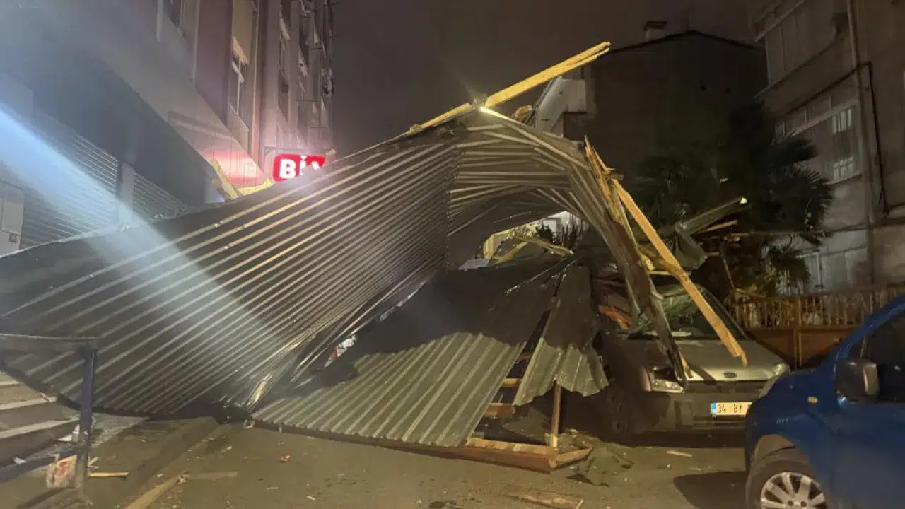 İstanbul’un Küçükçekmece ilçesinde etkili olan şiddetli rüzgar, 5 katlı bir binanın çatısının yerinden kopmasına neden oldu. Savrulan çatı, sokakta park halindeki üç araca zarar verdi.