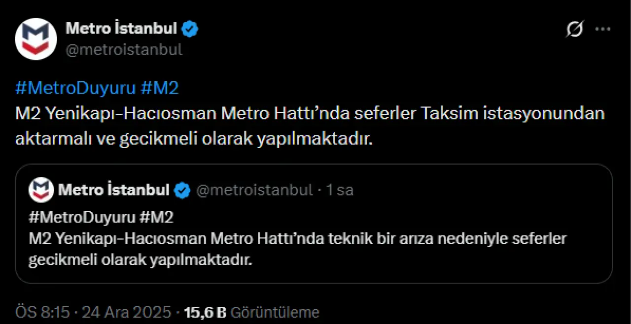 Metro İstanbul, M2 Yenikapı–Hacıosman Metro Hattı’nda yaşanan teknik bir arıza nedeniyle seferlerin gecikmeli olarak gerçekleştirildiğini duyurdu.