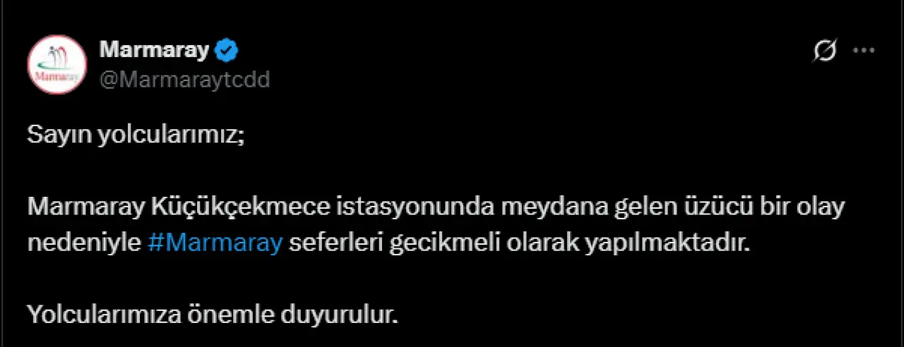 “Sayın yolcularımız; Marmaray Küçükçekmece istasyonunda meydana gelen üzücü bir olay nedeniyle Marmaray seferleri gecikmeli olarak yapılmaktadır. Yolcularımıza önemle duyurulur.”