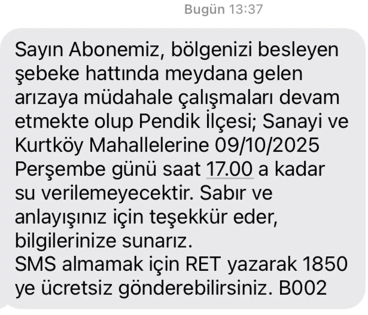 İSKİ’nin açıklamasına göre, Pendik İlçesi Sanayi ve Kurtköy Mahalleleri, 9 Ekim 2025 Perşembe günü saat 17.00'a kadar su alamayacak. Arızanın büyüklüğü ve hattın onarım süresi göz önüne alınarak, kesintiden etkilenen vatandaşların önlem almaları tavsiye edildi.