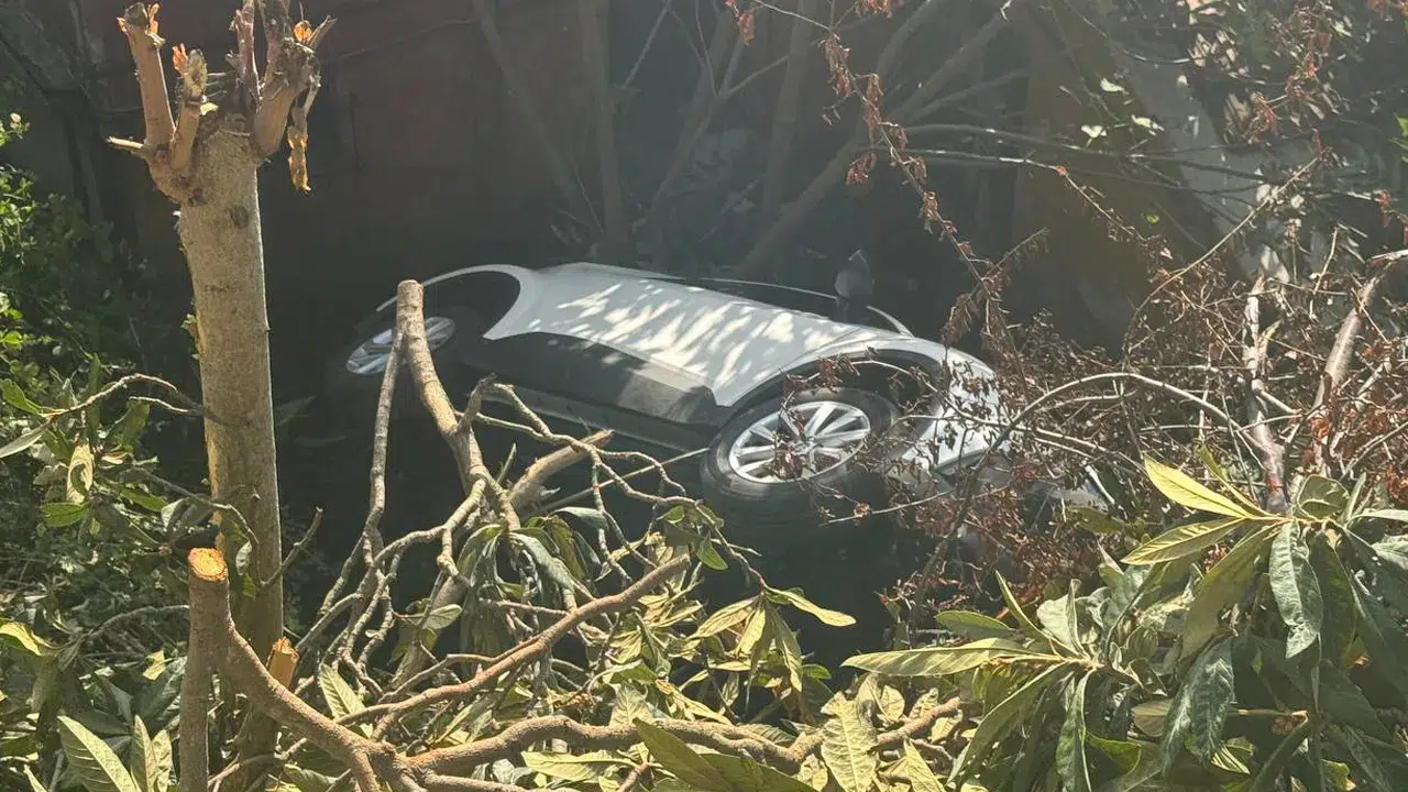 Çamlıtepe Mahallesi Çamlıtepe Cami Sokak'ta yokuş aşağı ilerlerken kaymaya başlayan otomobil, kontrolden çıkarak evin bahçesine düştü.