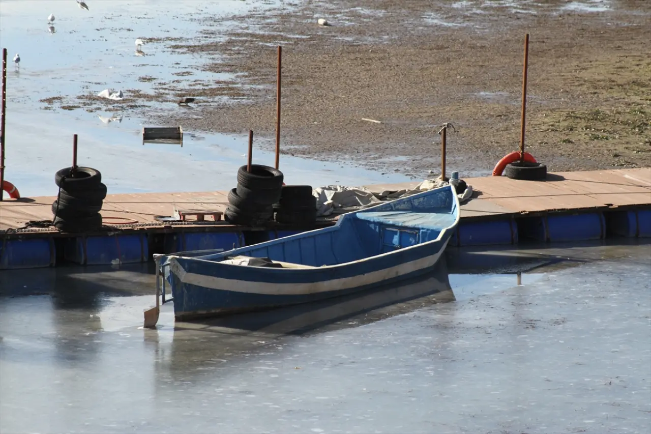 Konya'da Beyşehir Gölü'nün kıyıya yakın yüzeyi buzla kaplandı.