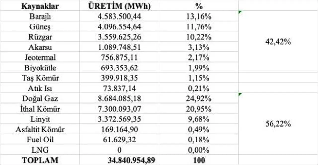 TEİAŞ verilerine göre, 2025 yılı Temmuz ayında Türkiye’nin toplam elektrik üretimi 34.84 TWh ulaşmış durumda. Bu üretimin %42,42’si yenilenebilir enerji kaynaklarından sağlanırken, güneş enerjisi %11,76’lık pay ile en yüksek üretim kalemlerinden biri oldu.