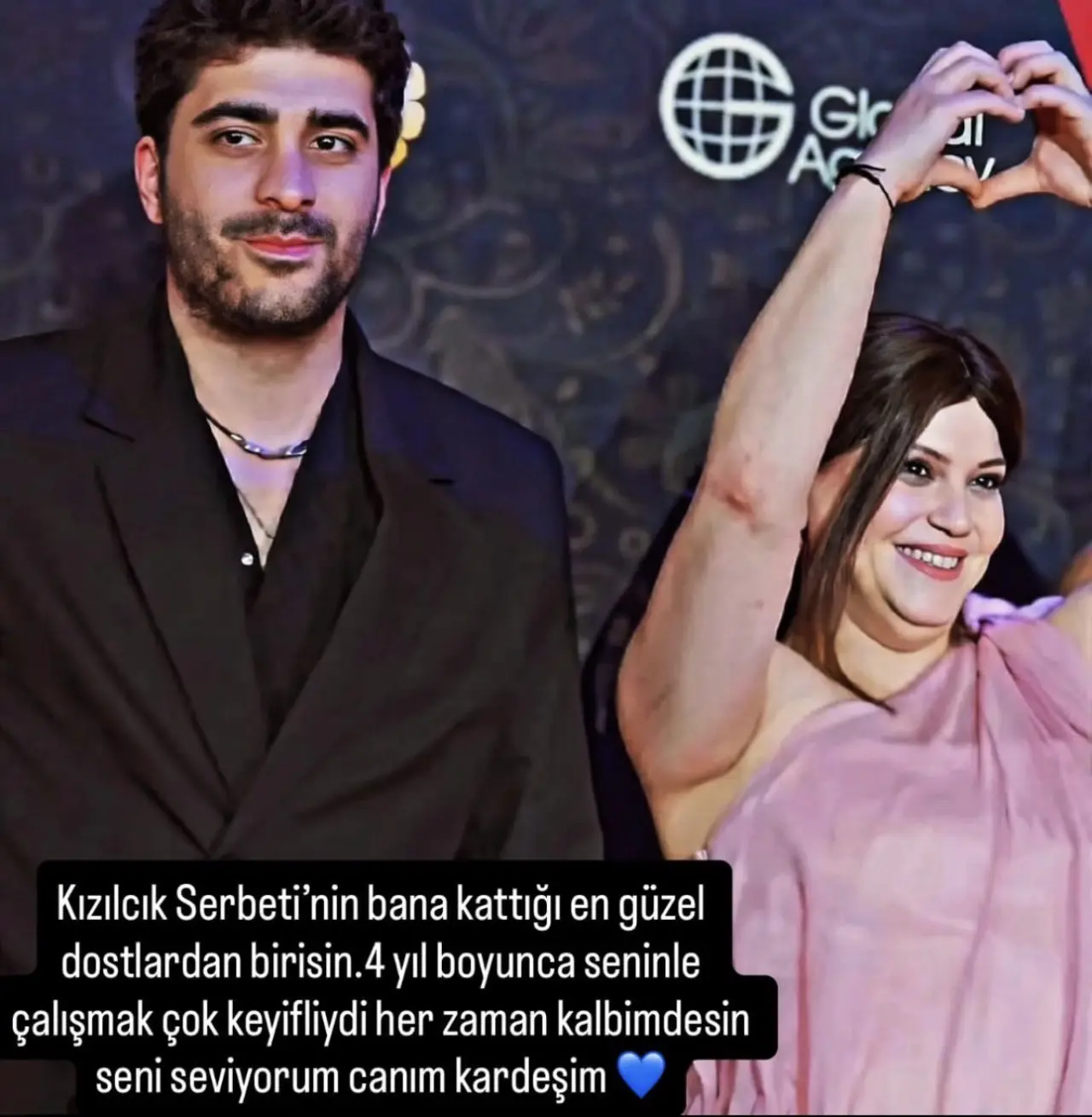 “Kızılcık Şerbeti'nin bana kattığı en güzel dostlardan birisin. 4 yıl boyunca seninle çalışmak çok keyifliydi. Her zaman kalbimdesin, seni seviyorum canım kardeşim.”