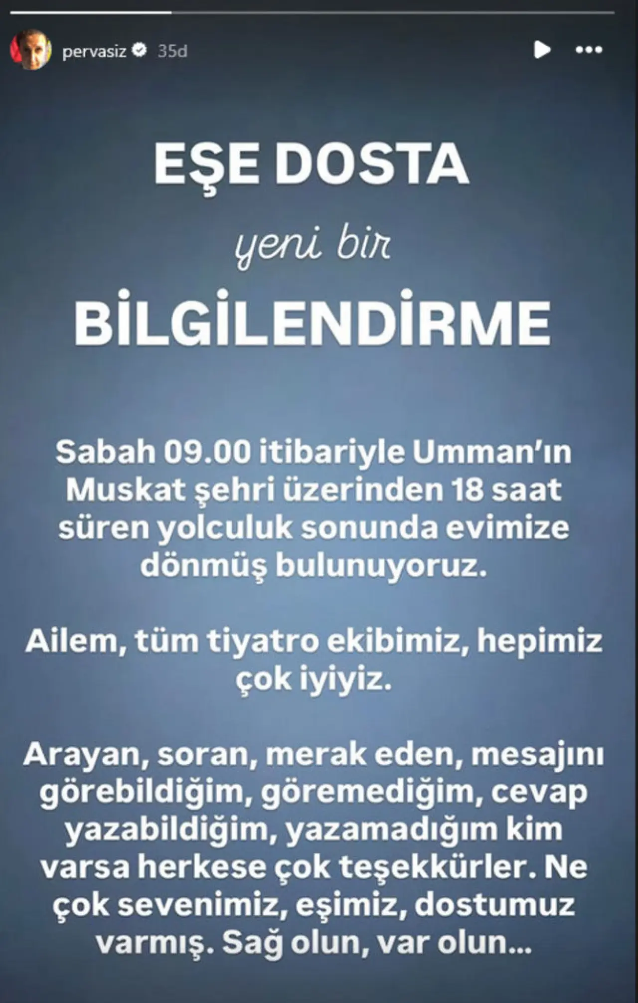 “Sabah 09.00 itibarıyla Umman'ın Maskat şehri üzerinden 18 saat süren yolculuk sonunda evimize dönmüş bulunuyoruz. Ailem, tüm tiyatro ekibimiz, hepimiz çok iyiyiz. Arayan, soran, merak eden, mesajını görebildiğim, göremediğim, cevap yazabildiğim, yazamadığım kim varsa herkese çok teşekkürler. Ne çok sevenimiz, eşimiz, dostumuz varmış. Sağ olun, var olun.”