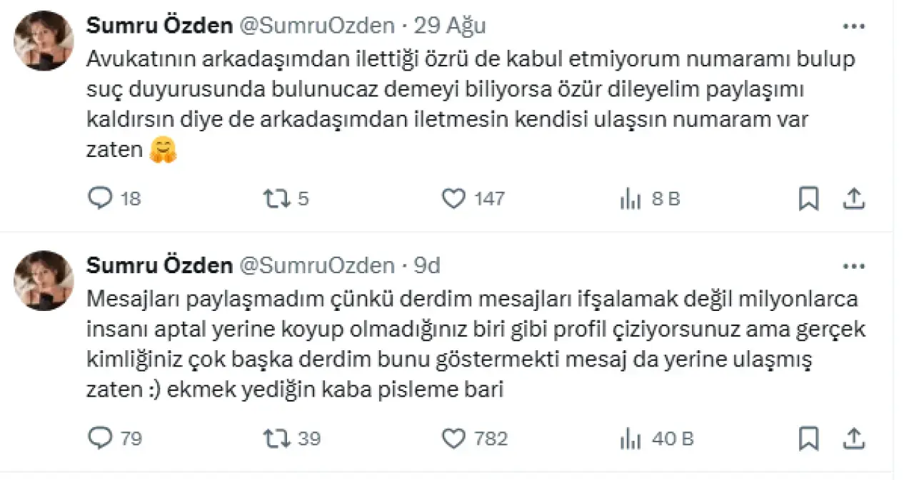 “Avukatının arkadaşımdan ilettiği özrü kabul etmiyorum. Numaramı bulup suç duyurusunda bulunmayı biliyorsa, özür dilemek için de paylaşımı kaldırsın diye bana kendisi ulaşsın. Zaten numaram var.”