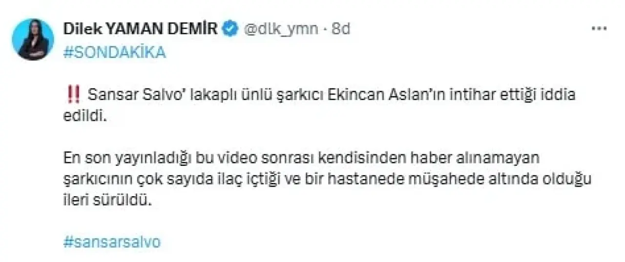 Gazeteci Dilek Yaman Demir tarafından ortaya atılan iddiaya göre, şarkıcı Sansar Salvo adıyla tanınan Ekincan Arslan'ın intihar girişiminde bulunduğu bildirildi. Bu gelişmenin ardından Salvo'nun hayatı ve kariyeri merak edildi. Peki, Sansar Salvo kimdir, kaç yaşında ve nereli? İşte detaylar…