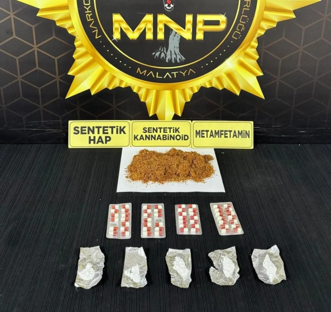 Yapılan aramalarda 623 gram sentetik kannabinoid, 156 adet sentetik ecza hap, 7 gram A-M sentetik kannabinoid hammaddesi, 25 gram metamfetamin maddesi ve 1 adet ruhsatsız tüfek ele geçirildi. Gözaltına alınan 7 şüpheli, emniyetteki işlemlerinin ardından sevk edildikleri adli makamlarca tutuklanarak cezaevine gönderildi.