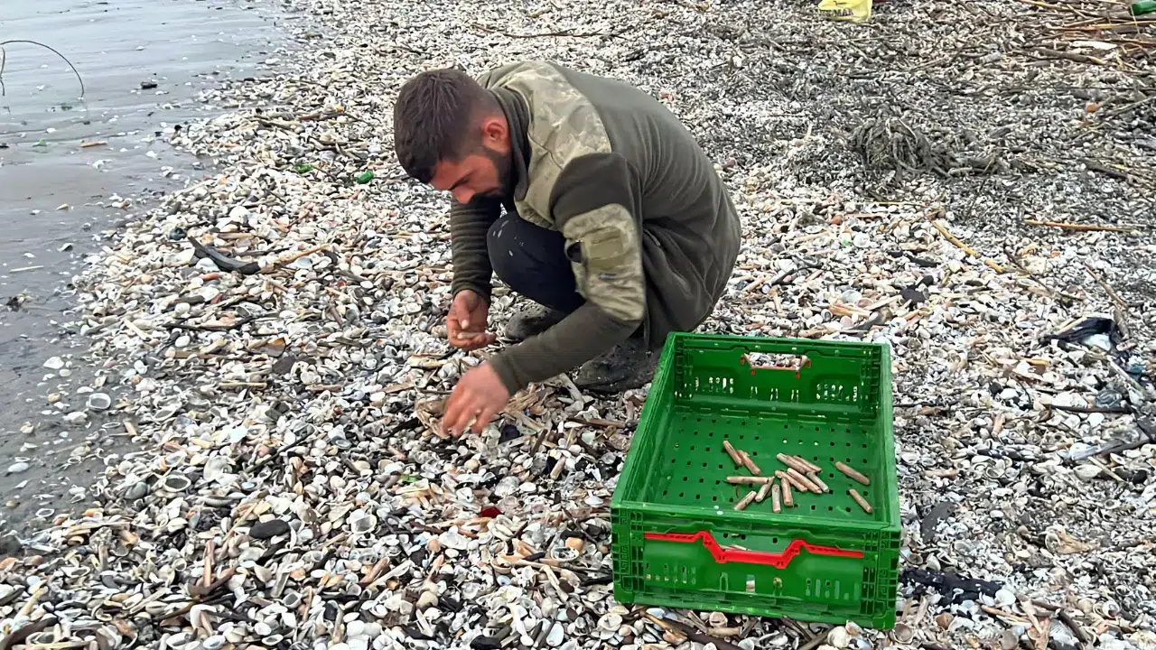 Uzun ve ince yapısıyla bilinen, halk arasında ‘jilet midyesi' olarak da adlandırılan deniz canlılarının sahili kaplaması dikkat çekti. Genellikle kumluk ve sığ deniz tabanında yaşayan, kendini kuma dikey şekilde gömerek yaşamını sürdüren kargı midyesinin Akdeniz ve Ege kıyılarında yaygın olarak görüldüğü belirtildi. Fırtına, sel ve güçlü dalgaların etkisiyle doğal yaşam alanlarından kopan midyeler, sahil boyunca geniş bir alana yayıldı. Sahili kaplayan kargı midyelerini gören balıkçılar, midyeleri kova ve çuvallara doldurdu. Balıkçılar, bu midyelerin balık avcılığında yem olarak kullanıldığını ifade etti.