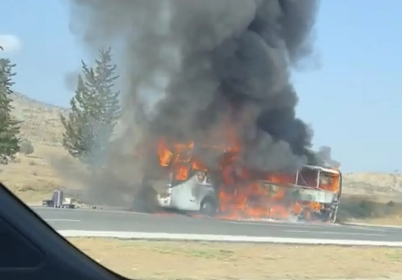 Aracı güvenlik şeridinde durduran sürücü, 34 yolcuyu tahliye edip durumu 112 Acil Çağrı Merkezine bildirdi.