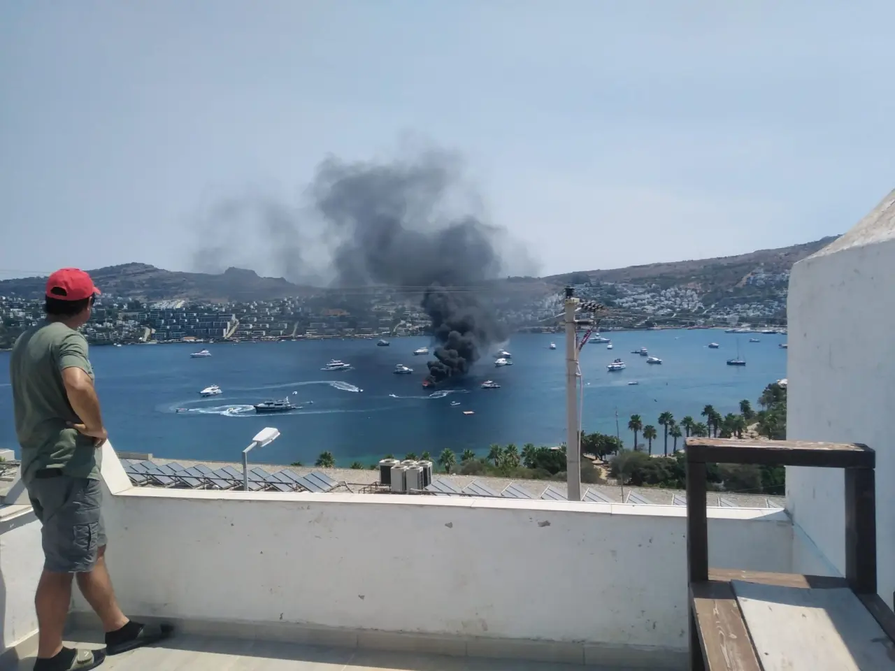 Muğla'nın Bodrum ilçesi Gündoğan Koyu'nda, demirli bir teknede henüz belirlenemeyen nedenle yangın çıktı. Tekne kısa sürede alev topuna dönerken, içeride bulunan 1 kişi çevredeki botlar yardımıyla kurtarıldı.