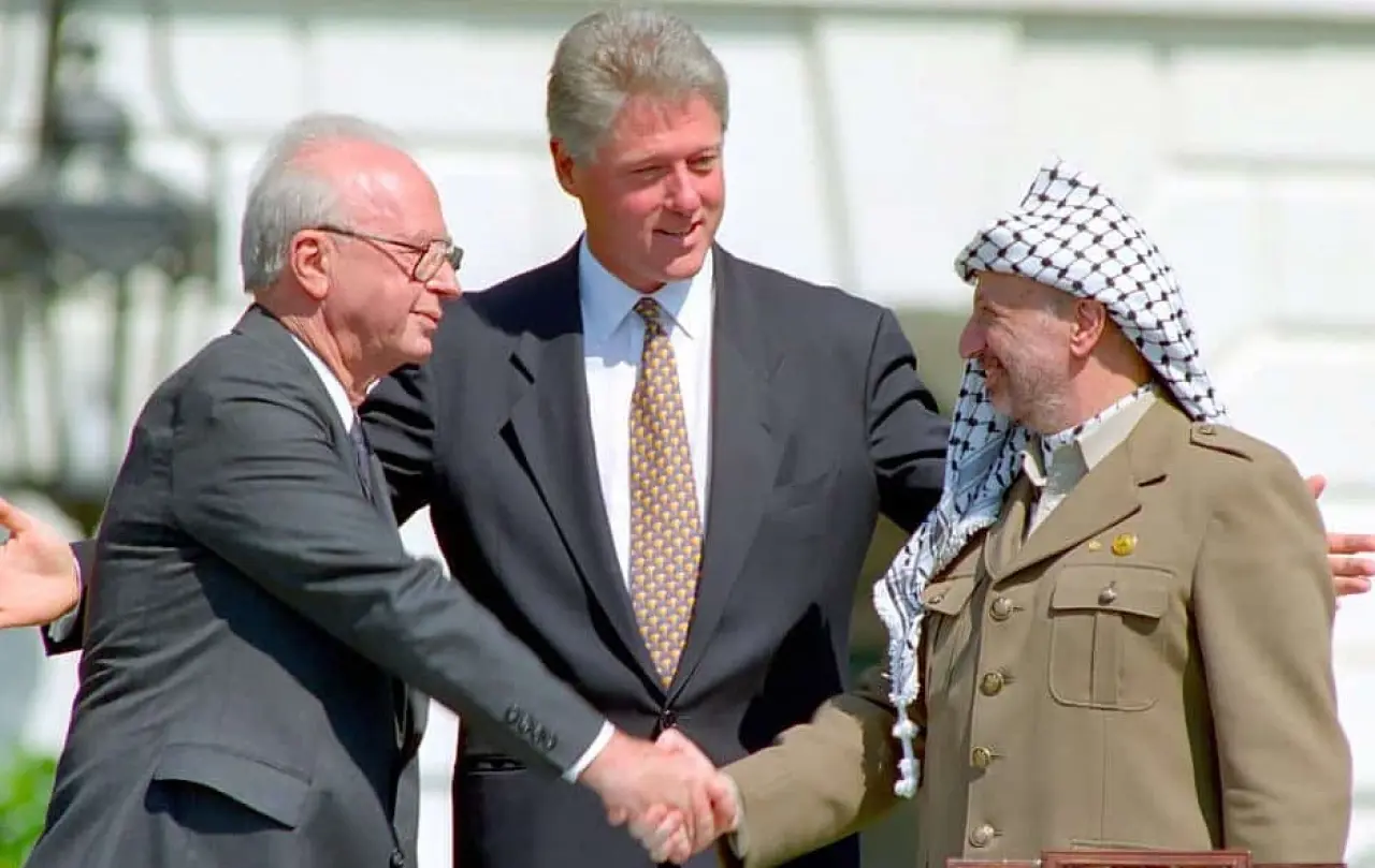 İsrail Başbakanı Yitzhak Rabin ile Filistin lideri Yaser Arafat, 13 Eylül 1993'te Washington'daki Beyaz Saray bahçesinde tarihi bir el sıkışma gerçekleştirdiler. İki lider, onlarca yıl süren çatışma ve düşmanlığın ardından Oslo Barış Anlaşması’nın imzalanmasıyla ilk kez yüz yüze gelip el sıkışmış oldu. Tören sırasında ABD Başkanı Bill Clinton’ın teşvikiyle gerçekleşen bu zoraki fakat çığır açan tokalaşma, İsrail ile Filistin Kurtuluş Örgütü arasında yeni bir diyaloğun başlangıcını simgeledi. Rabin bu tarihi günün duygusallığı içinde, ‘30 yıl süren terörden sonra barışı öğrenmenin zorluğunu’ vurgulayarak, “Barış, bazen nefret ettiğiniz ezeli düşmanlarla yapılır” diyerek barışın ancak düşmanlar arasında mümkün olabileceğini belirtti. Bu kare, eski ezeli düşmanların barış için yan yana gelebileceğinin en ünlü sembollerinden biri haline gelmiştir.
