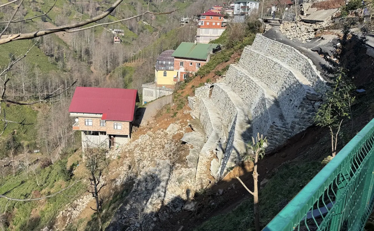 Rize'nin Bayırcık köyünde dün meydana gelen heyelanın ardından istinat duvarının çöktüğü alana gelen ekipler, hasar gören ev ve çevresinde araştırma yaptı.
