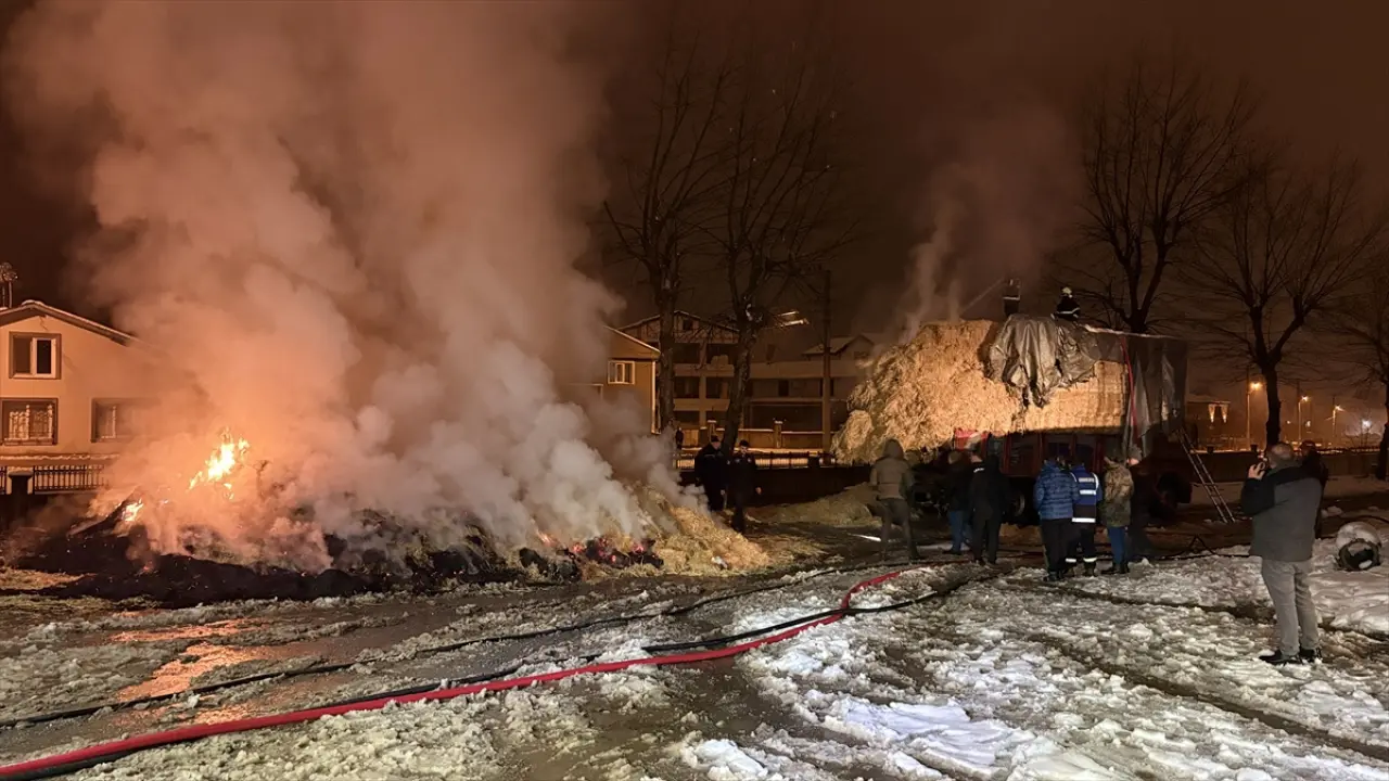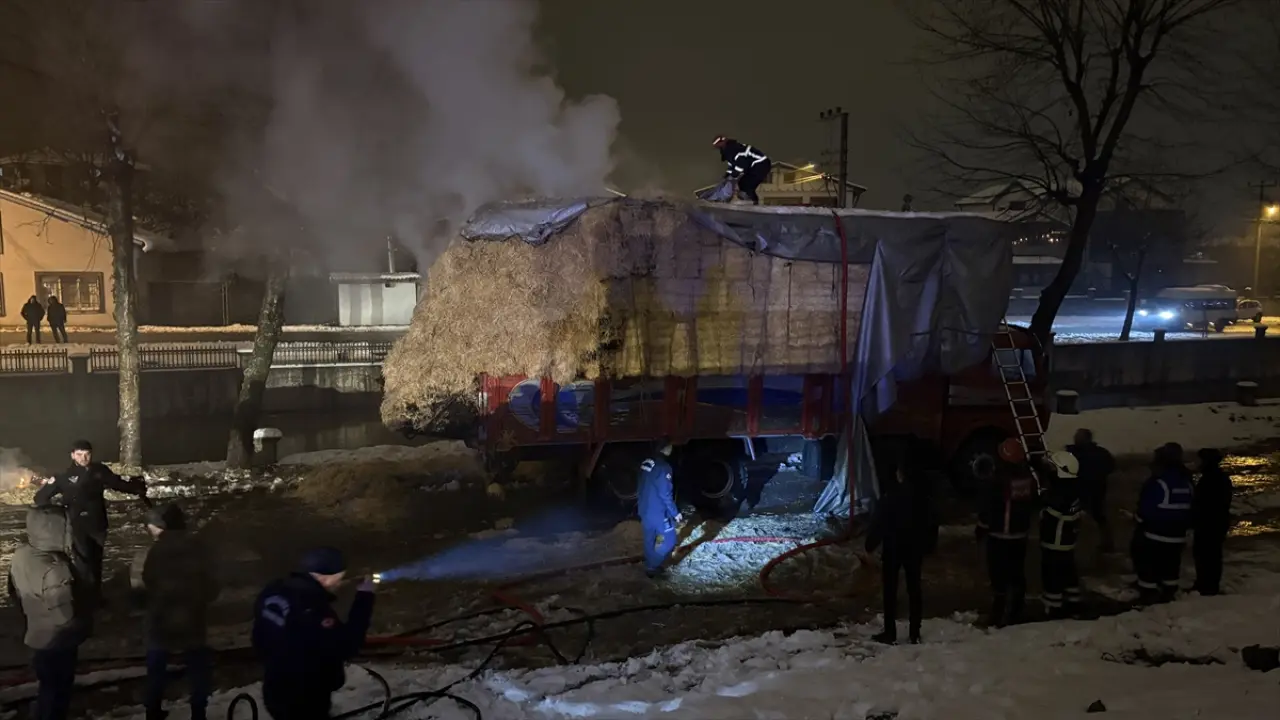 Sakarya'nın Hendek ilçesi Yeni Mahalle 3504 Sokak üzerinde park halinde bulunan, Ali G. idaresindeki 55 K 1559 plakalı saman yüklü tır, henüz belirlenemeyen bir nedenle alevlere teslim oldu.