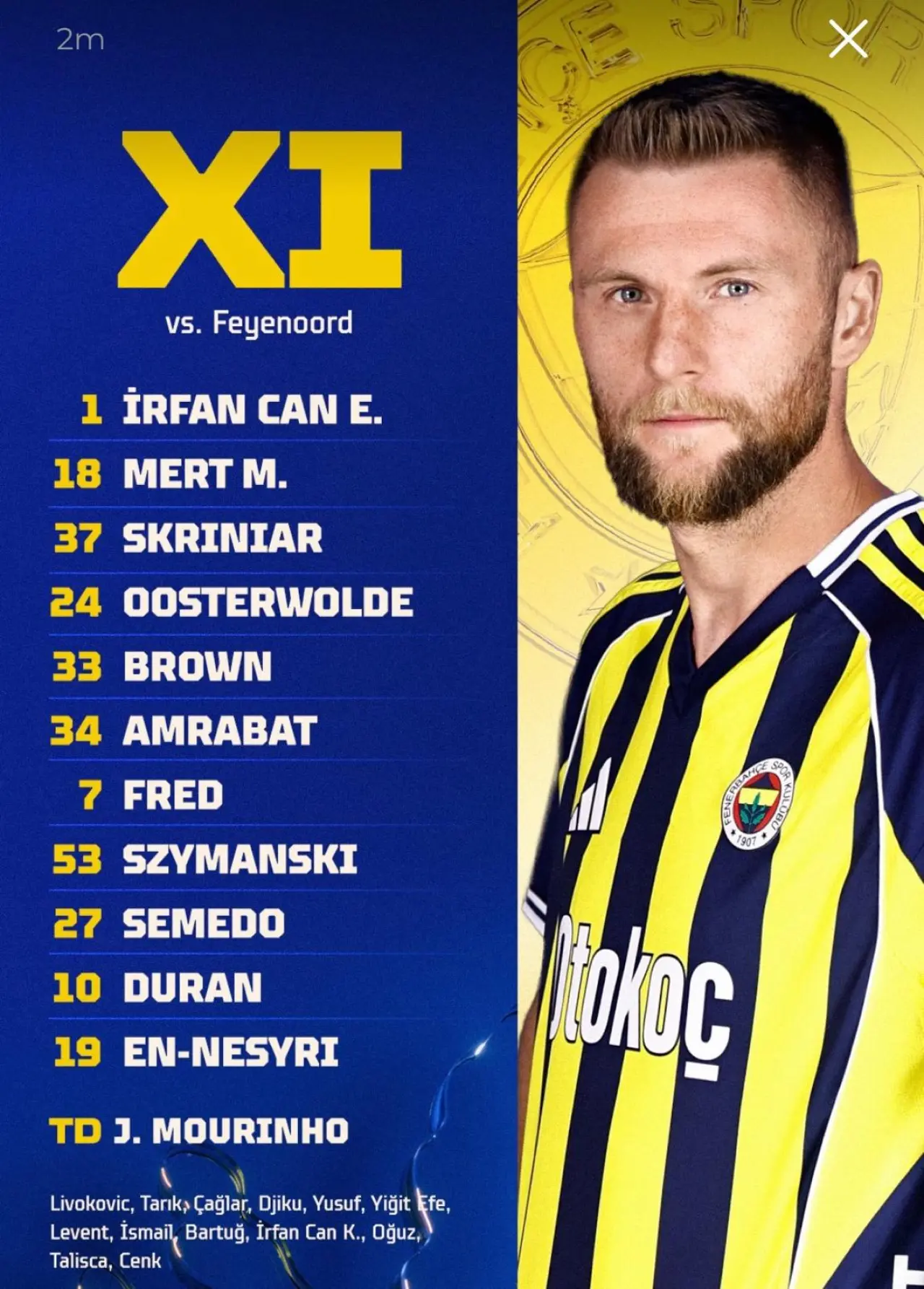 Fenerbahçe: İrfan Can Eğribayat, Semedo, Mert Müldür, Skriniar, Oosterwolde, Brown, Amrabat, Fred, Szymanski, Duran, En-Nesyri..