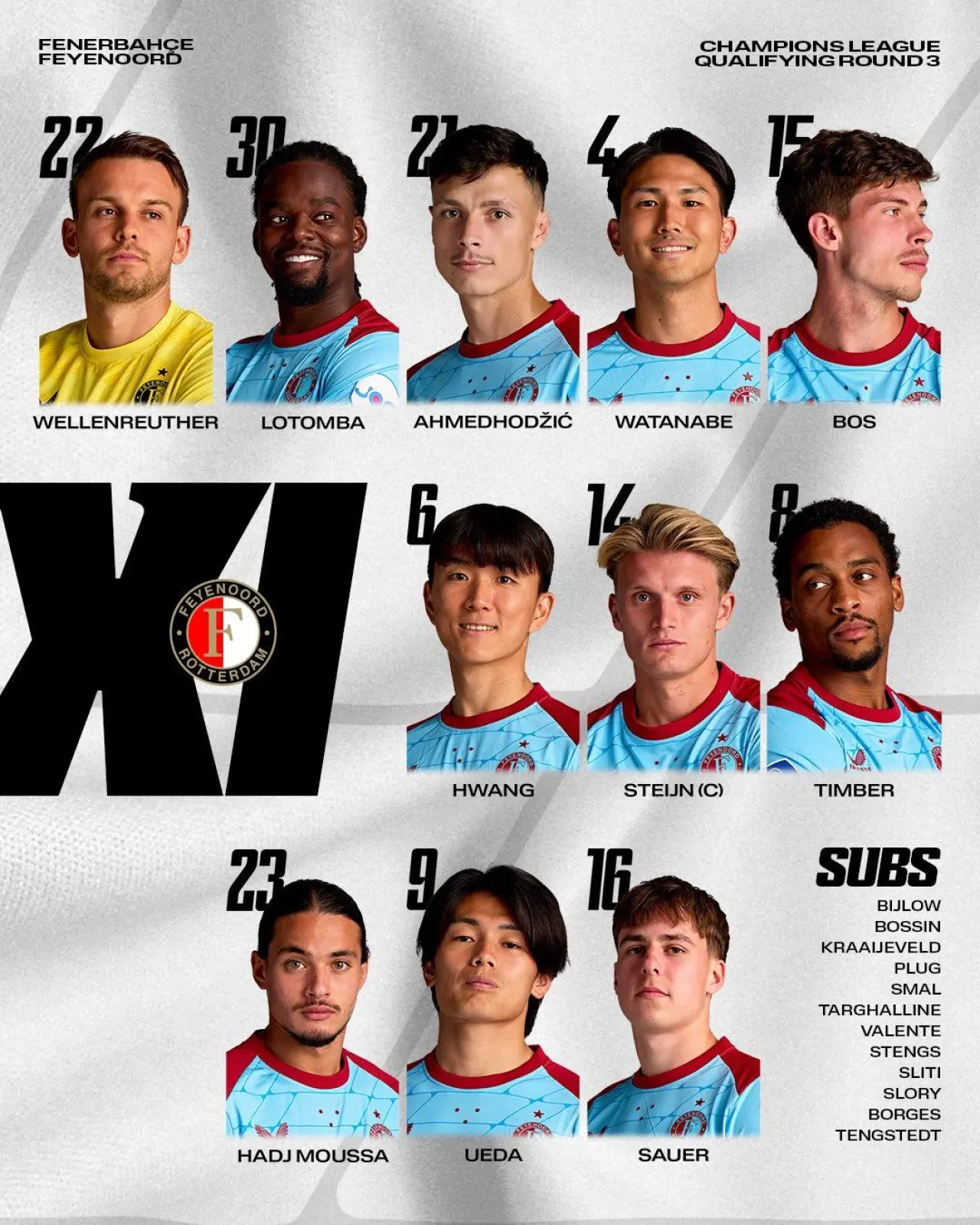 Feyenoord: Wellenreuther, Lotomba, Ahmedhodzic, Watanabe, Bos, Timber, Hwang, Steijn, Hadj-Moussa, Sauer, Ueda.