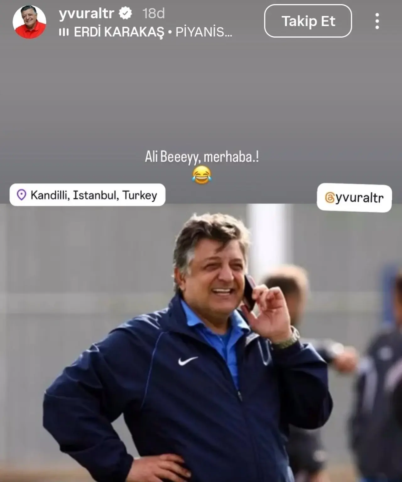 Tecrübeli teknik direktör, sosyal medya hesabında telefonda konuşurken çekilmiş bir fotoğrafını paylaştı. Fotoğrafın altına ise Fenerbahçe Başkanı Ali Koç’a göndermede bulunarak “Ali Beeeyy, merhaba” notunu ekledi.
