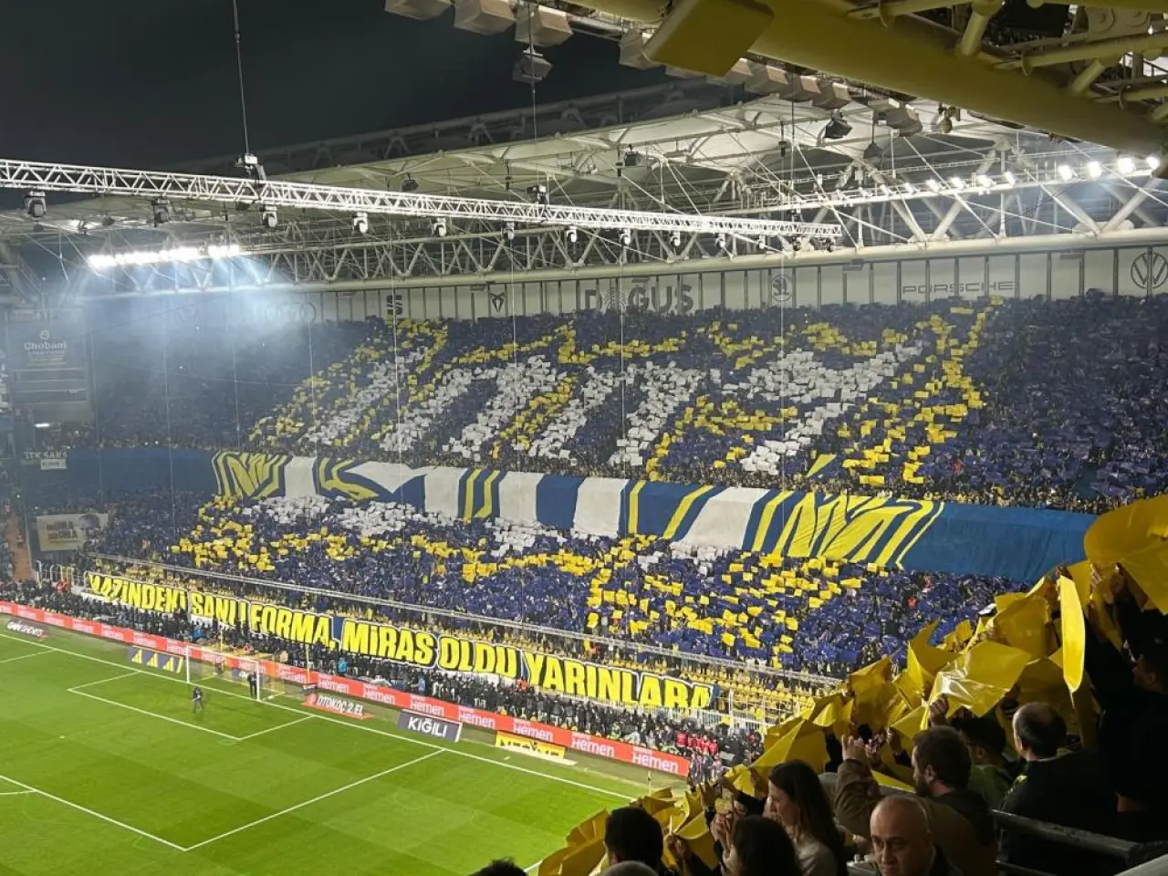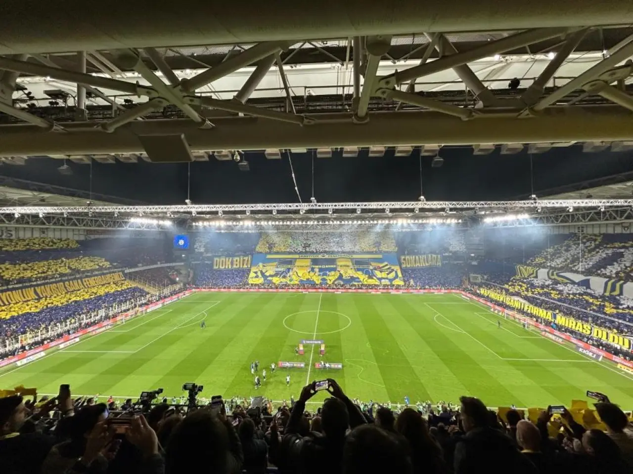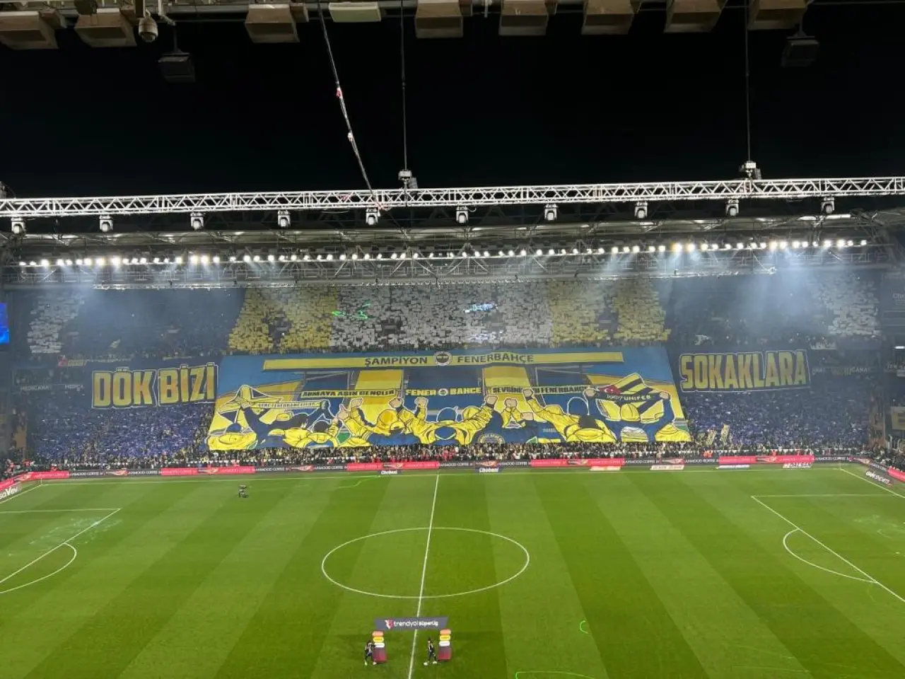 Stadın tüm tribünlerinde sarı-lacivert renkli kartonlar açılarak görsel bir şölen oluşturuldu. Taraftarların hazırladığı bu koreografi, derbi heyecanını artıran önemli unsurlardan biri oldu.