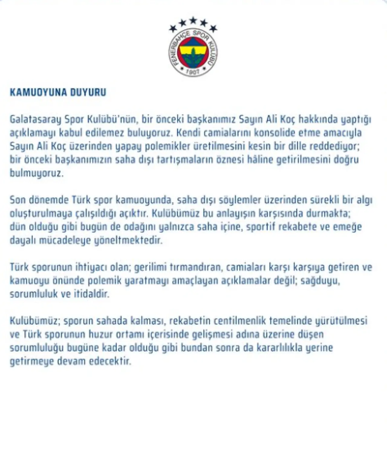 Fenerbahçe Spor Kulübü, resmi kanalları aracılığıyla yayımladığı "Kamuoyuna Duyuru" metniyle, Galatasaray cephesinden gelen eleştirilere karşı net bir duruş sergiledi. Kulüp, bir önceki başkanları Sayın Ali Koç hakkında yapılan açıklamayı hiçbir şekilde kabul etmediğini ve bu tutumun Türk sporuna zarar verdiğini belirtti. Sarı-lacivertli yönetim, eski bir başkanın bu tür saha dışı tartışmaların öznesi ve odağı haline getirilmesini etik olarak doğru bulmadığını özellikle vurguladı.
