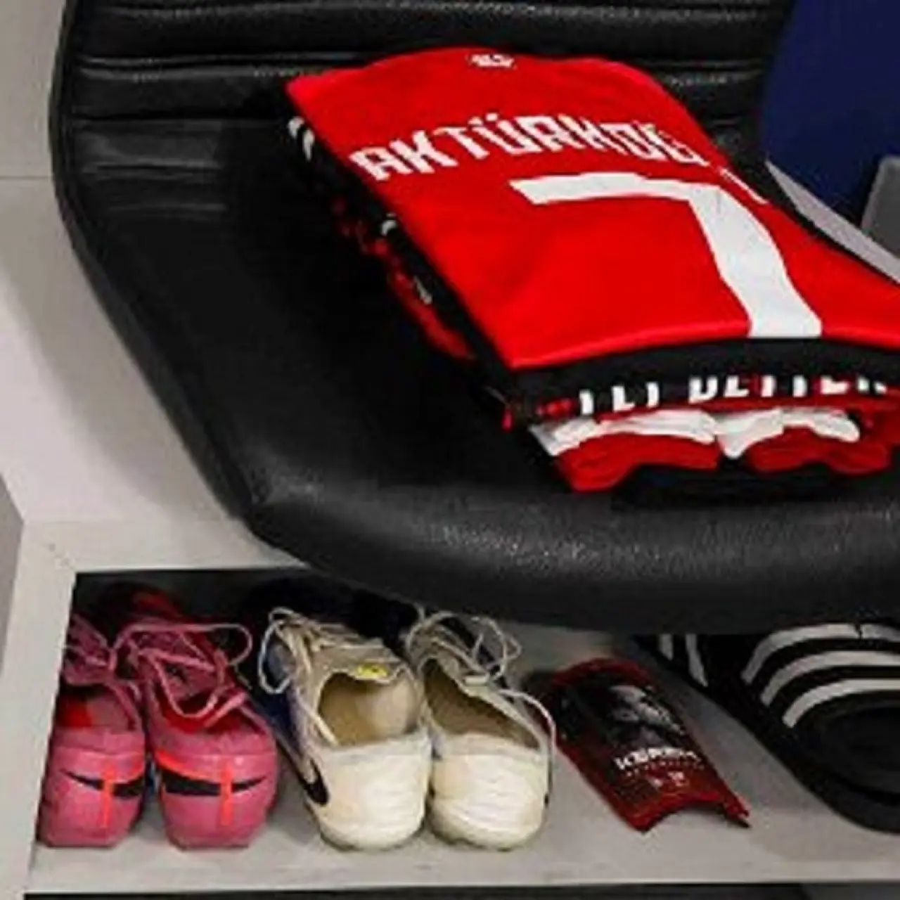 Maç öncesinde Kerem Aktürkoğlu’nun malzemelerinin bulunduğu soyunma odasında çekilen fotoğraflarda, oyuncunun tekmeliklerini değiştirdiği görüldü.