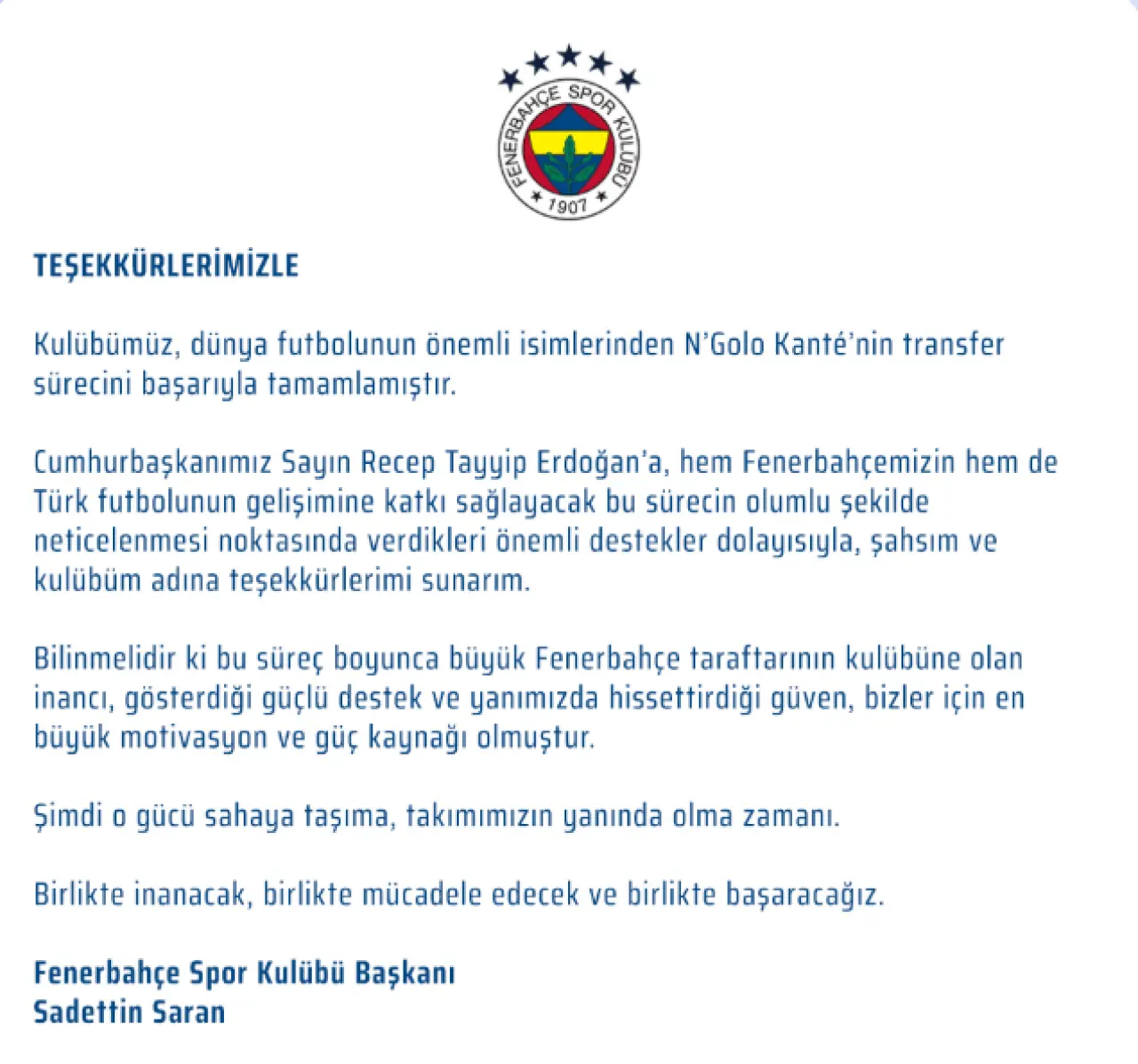 Fenerbahçe Spor Kulübü, dünya futbolunun en önemli isimlerinden biri olan Fransız yıldız N’Golo Kanté transferinde mutlu sona ulaştı. Kulüp binasından yapılan resmi açıklamada, sürecin başarıyla tamamlandığı bildirilirken, Fenerbahçe Başkanı Sadettin Saran transferin perde arkasındaki önemli bir desteğe dikkat çekti.