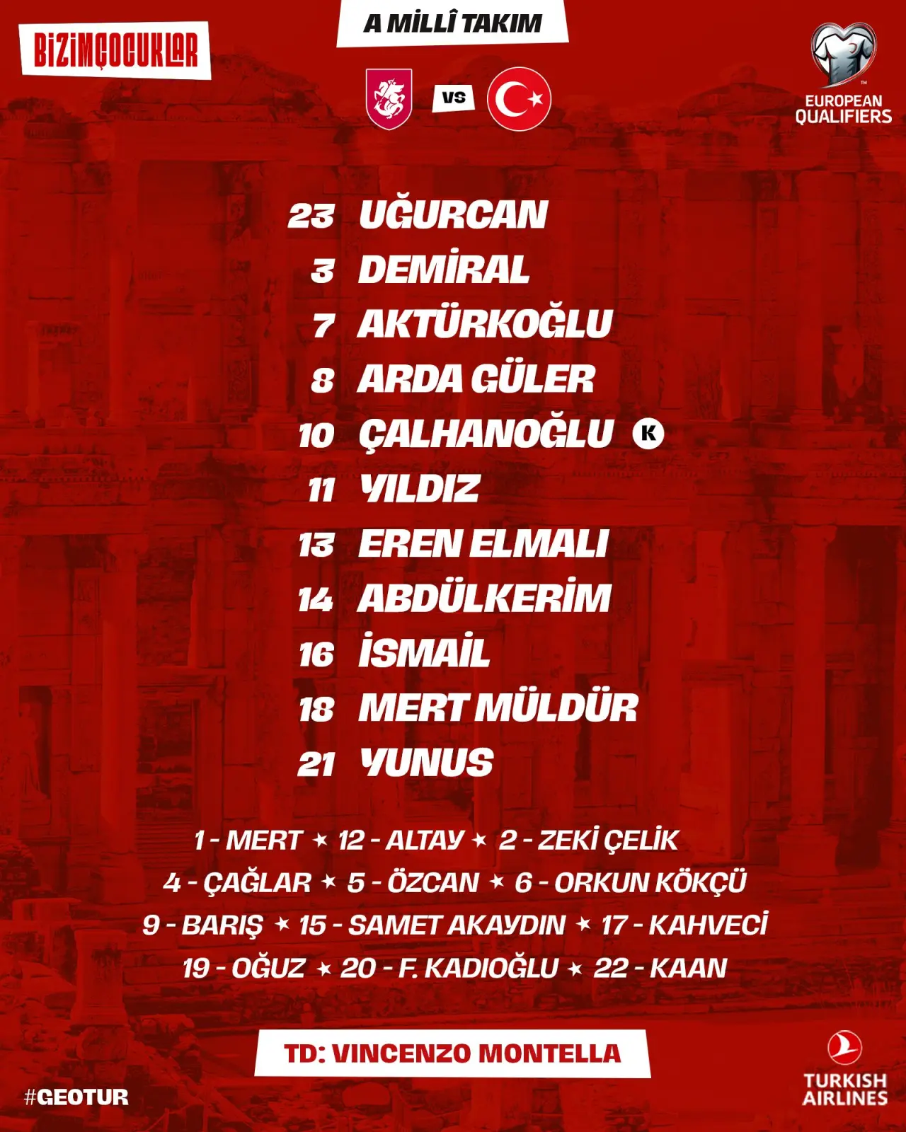 Türkiye: Uğurcan, Mert, Merih, Abdülkerim, Eren Elmalı, İsmail, Hakan, Yunus, Arda, Kenan, Kerem