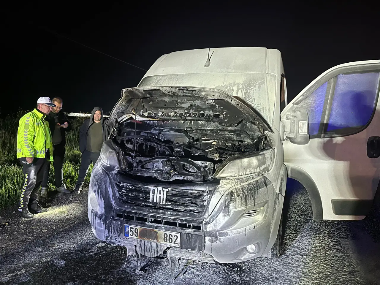 Fabrikadan aldığı işçileri bırakmak için yola çıkan Ömer T. idaresindeki 59 AIZ 862 plakalı servis minibüsünün motor kısmından dumanlar yükseldi. Sürücü aracı yol kenarına çekerek yolcuları tahliye etti. Yoldan geçen araç sürücülerinin yangın tüpleriyle ve itfaiyenin müdahalesiyle yangın büyümeden söndürüldü. Olay yerine gelen Ergene İlçe Emniyet ve Çorlu Bölge Trafik ekipleri, güvenlik ve trafik tedbirleri aldı. Aracın ön kısmı zarar görürken yangının çıkış sebebiyle ilgili çalışma başlatıldı.