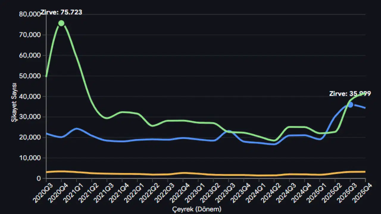 Bilgi Teknolojileri ve İletişim Kurumu (BTK), 2025 yılı dördüncü çeyrek verilerini içeren Elektronik Haberleşme Sektörü Pazar Verileri Raporu’nu kamuoyuna sundu. BTK Online Tüketici Şikayet Sistemi üzerinden iletilen veriler ve Bt Dünyası'dan alınan bilgilere , mobil operatörlere yönelik şikayet sayısında çarpıcı bir artış yaşandığını ortaya koydu. 2024 yılı ortalarında 16 bin seviyelerine kadar gerileyen şikayetler, 2025 yılının son çeyreğinde 34 bin 368 olarak kayıtlara geçti.