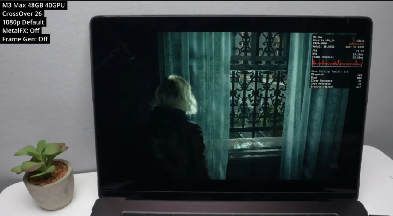 Yeni nesil donanımlarda ise sonuçlar oldukça çarpıcı. 48 GB birleşik bellek ve 40 çekirdekli GPU’ya sahip bir M3 Max MacBook Pro üzerinde yapılan testlerde, oyun 1080p çözünürlükte ve varsayılan ayarlarda yaklaşık 70 FPS değerlerine ulaştı. MetalFX ve kare oluşturma (frame generation) teknolojileri kapalıyken elde edilen bu sonuç, donanımın ölçeklendirmeye ihtiyaç duymadan oyunu akıcı bir şekilde oynatabildiğini gösteriyor.