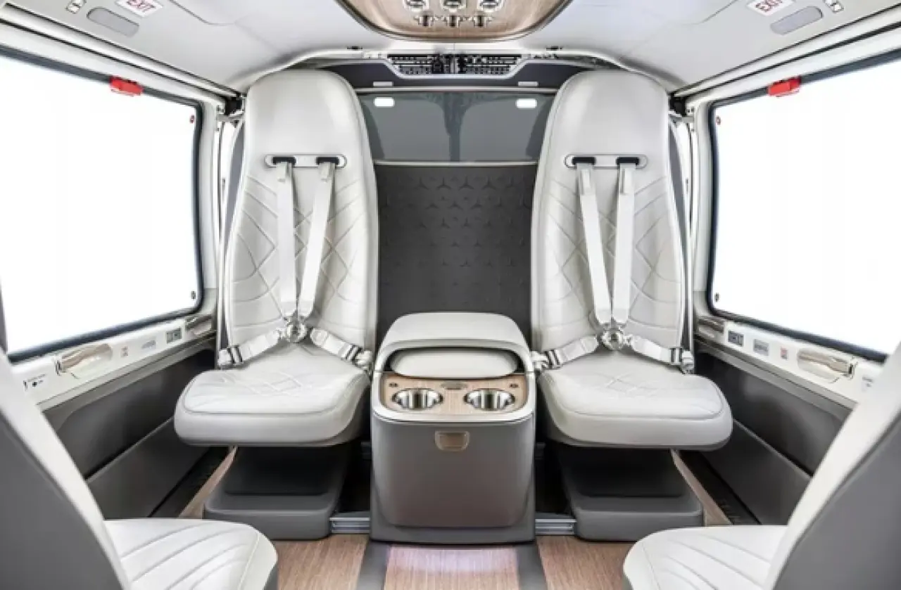 Kabin tasarımı, Mercedes-Benz’in Maybach ve EQS modellerinde kullanılan materyallerden ilham alınarak oluşturuldu. İç mekanda yüksek kaliteli deri, ahşap zeminler ve alüminyum bileşenler kullanılırken, kullanıcılara altı farklı tasarım konfigürasyonu sunuluyor. Kabin düzeni, ihtiyaca göre 4 ila 8 yolcu kapasitesine sahip olacak şekilde ayarlanabiliyor.