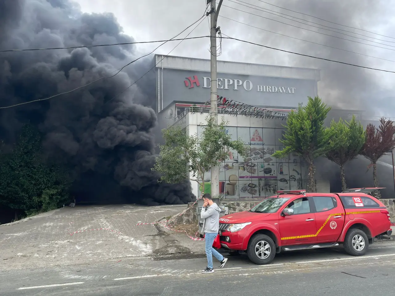 Trabzon'un Akçaabat ilçesinde hırdavat ve yapı malzemeleri satışı yapılan bir alışveriş merkezinde çıkan yangın söndürülmeye çalışılıyor.