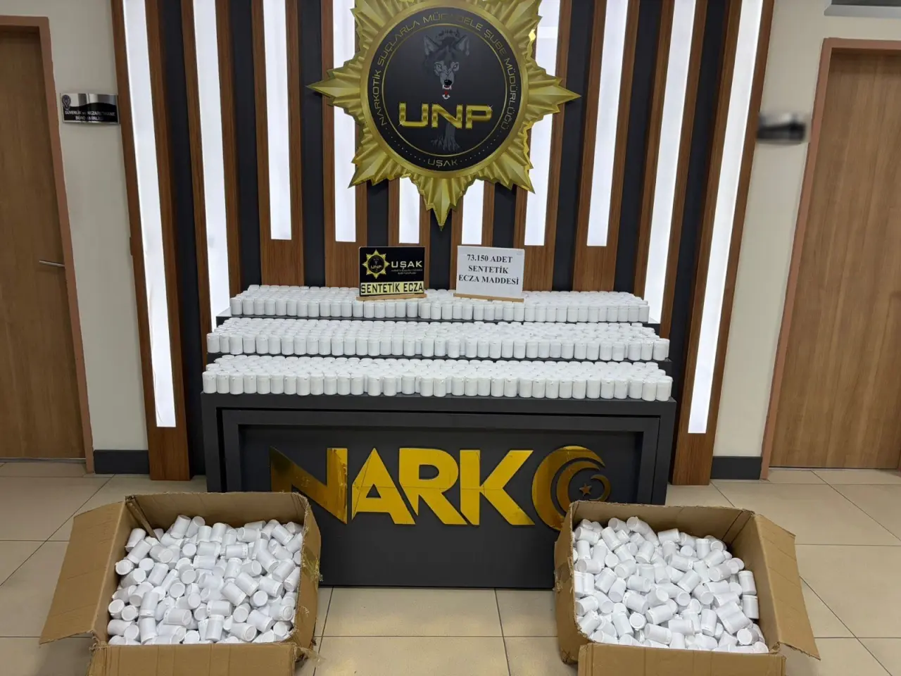 Uşak İl Emniyet Müdürlüğü Narkotik Suçlarla Mücadele Şube Müdürlüğü ekipleri, "Uyuşturucu Madde Ticareti" ile mücadele çalışmaları kapsamında şehir merkezinde 2 ayrı operasyon gerçekleştirdi. Operasyonlarda yapılan aramada 73 bin 740 sentetik ecza, 240 gram sentetik kannabinoid elde edilecek düzeyde 2,4 gram sentetik kannabinoid ham maddesi, bir miktar metamfetamin ve suçtan elde edildiği düşünülen 46 bin 800 Türk Lirası ele geçirildi. Operasyonlar kapsamında 4 şüpheli gözaltına alındı.