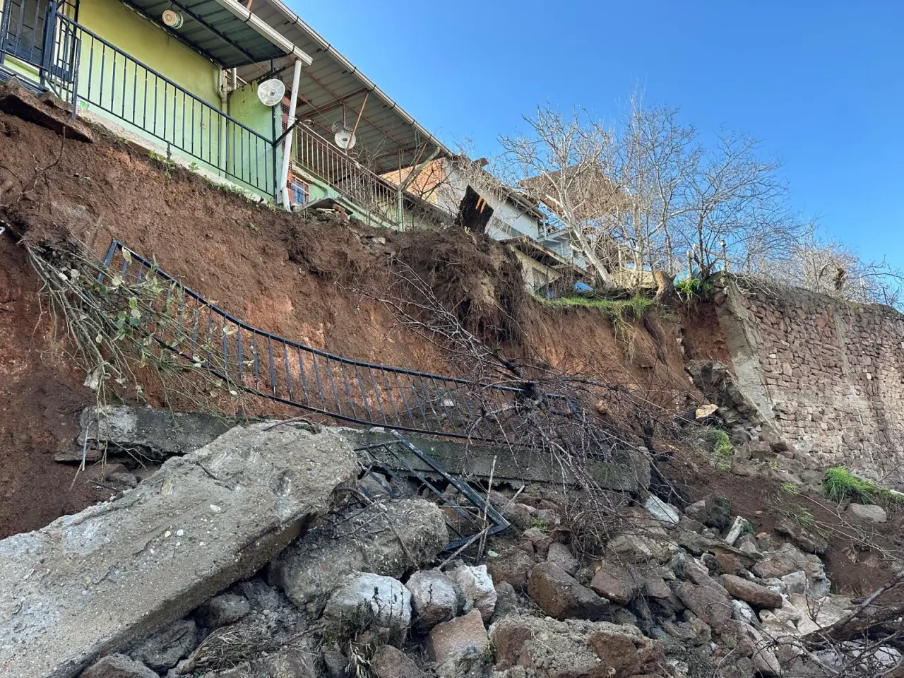 Işık Mahallesi İkinci Şafak Sokak’ta istinat duvarının çökmesi sonucu risk oluştu. Duvarın üst kısmında bulunan 2 evde yaşayan 3 kişi güvenlik gerekçesiyle tahliye edildi. Olay yerine AFAD, polis ve itfaiye ekipleri sevk edilirken, bölgede güvenlik önlemleri alındı.