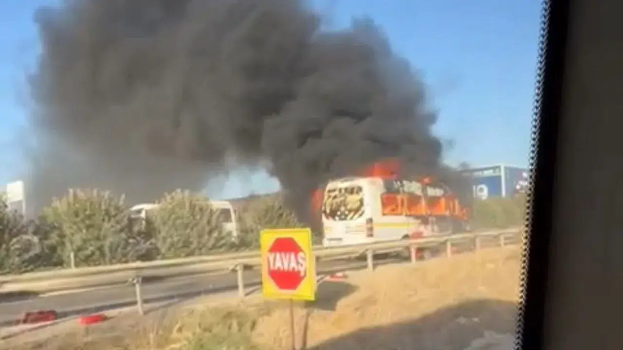 Bir taraftan da 112’ye haber verildi. İtfaiye ekipleri gelene kadar servis yangın tüpleriyle söndürülmeye çalışıldı. Bir süre sonra gelen itfaiye ekipleri yangını söndürdü. Servis aracından geriye demir yığını kaldı.