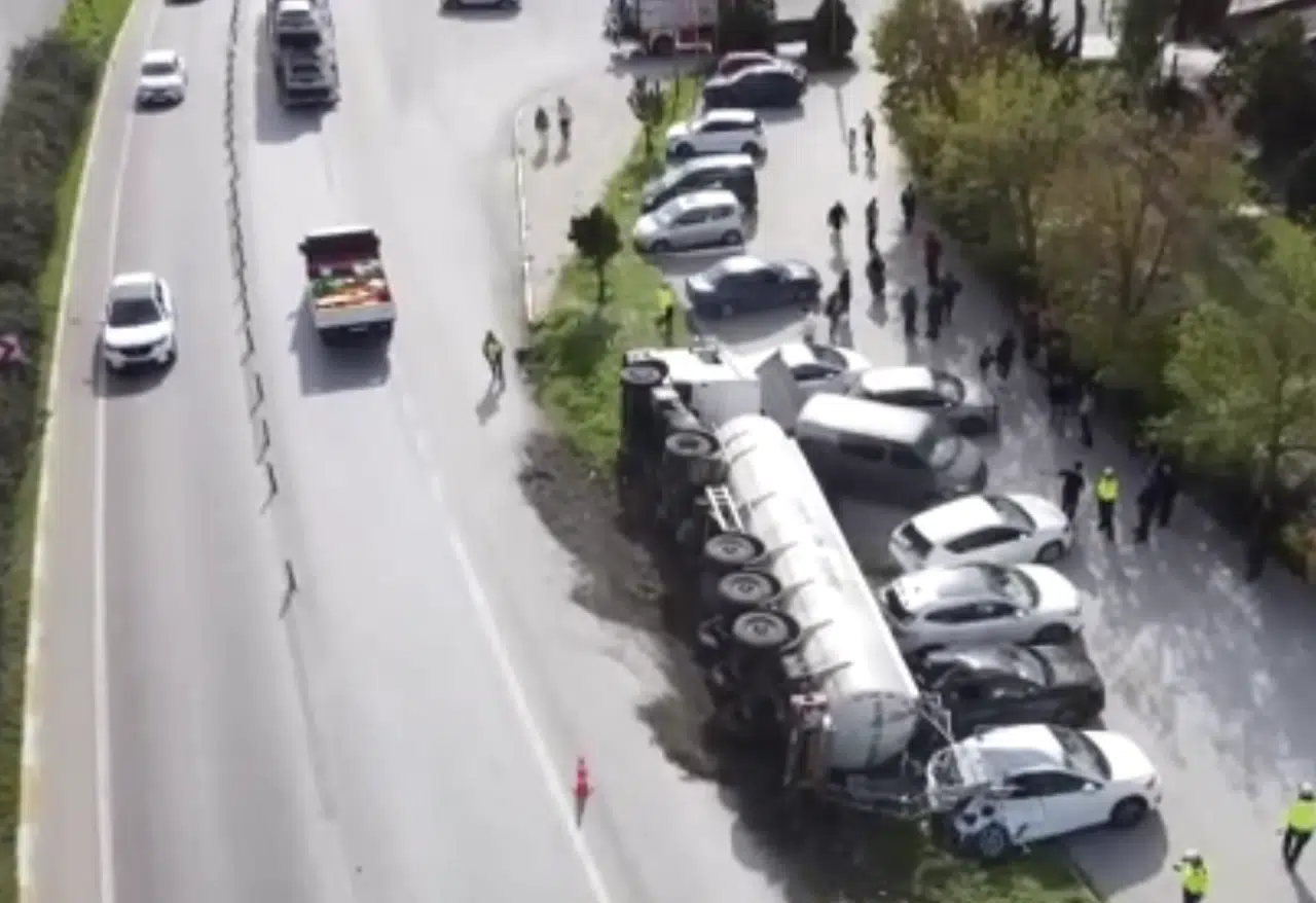 Olay, Balıkesir’de Değirmenbogazi piknik alanının önünde meydana geldi. Bursa yönünden Balıkesir istikametinde gelen M.G. yönetimindeki 63 AIM 790 plakalı ayçiçek yağı yüklü tanker, direksiyon hakimiyetinin kaybedilmesi sonucu park halindeki otomobillerin üzerine devrildi.