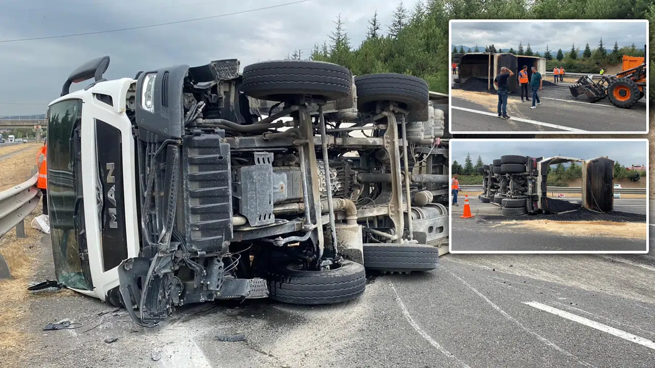 Anadolu Otoyolu Düzce kesiminde, asfalt yüklü kamyonun devrilmesi sonucu İstanbul istikameti trafiğe kapatıldı. Kazada sürücü yara almadan kurtuldu.