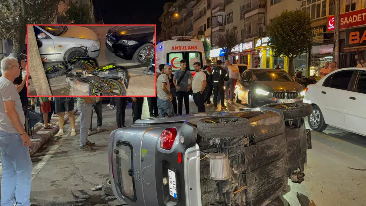 Düzce'de elektrikli otomobil ile motosikletin çarpıştığı kazada 3 kişi yaralanırken, kaza anında kaldırımdan geçen 3 kişi saniyelerle kurtuldu.