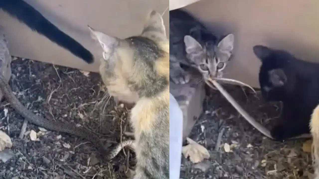 Kedilerin yılanla oynaması, çevrede bulunan bir vatandaş tarafından cep telefonu kamerasıyla kaydedildi. Görüntülerde kedilerin yılanı yakaladıktan sonra etrafında dönerek patileriyle vurduğu, ağzına almaya çalıştığı, yılanın ise sabit durduğu anlar yer aldı.